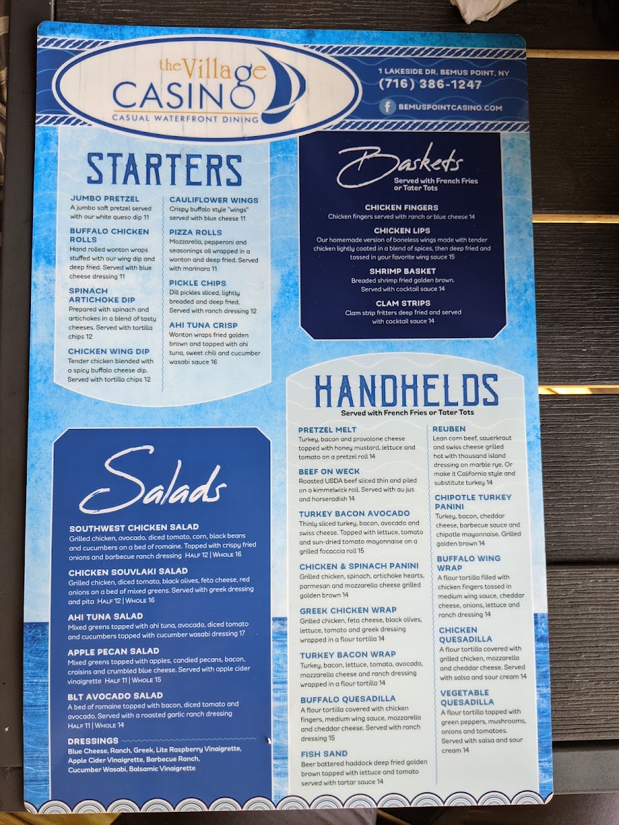 The Village Casino menu offers a variety of classic American fare with a casual, approachable vibe. You’ll find a selection of comforting bites and hearty dishes designed for relaxed dining, whether you’re stopping by for a casual lunch or settling in for a laid-back dinner by the lake.